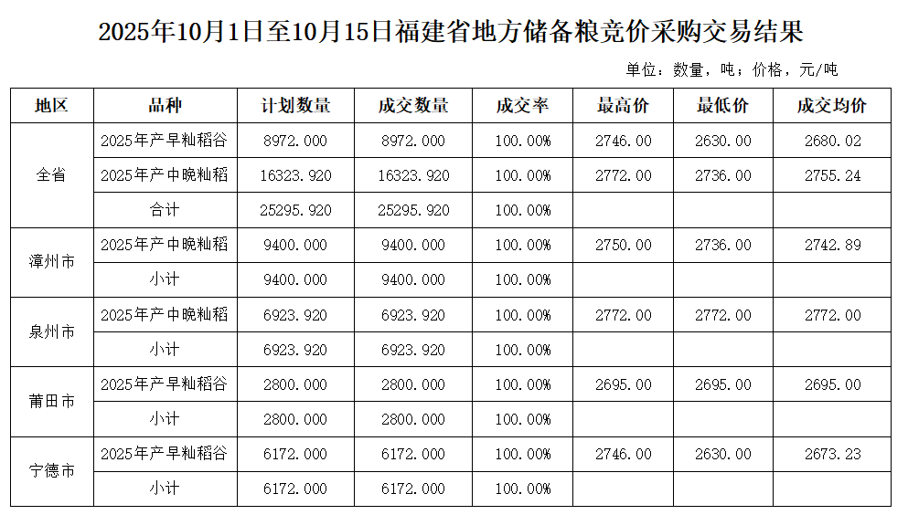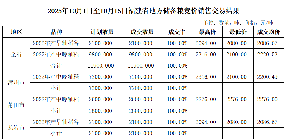 - 2025年10月1日至10月15日福建省地方储备粮竞价采购交易结果 10-17