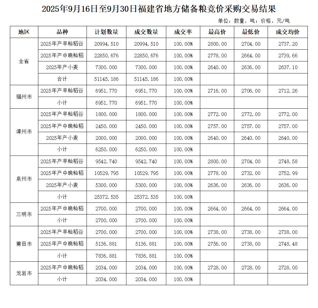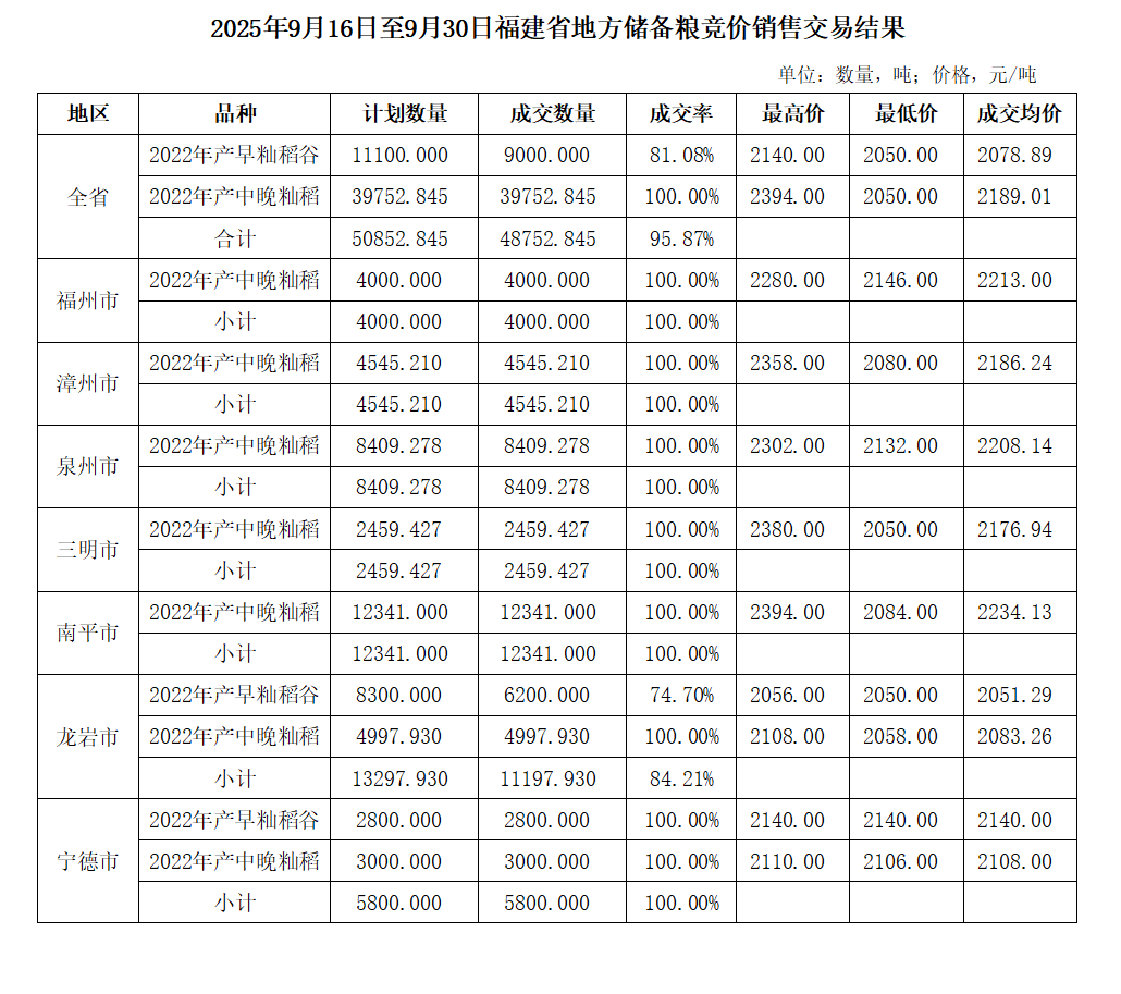- 2025年9月16日至9月30日福建省地方储备粮竞价采购交易结果 10-09