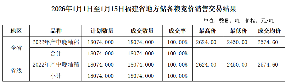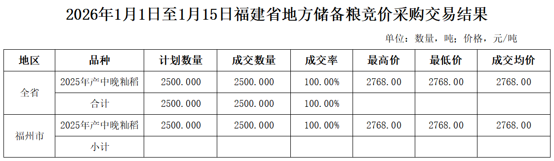 - 2026年1月1日至1月15日福建省地方储备粮竞价采购交易结果 01-16