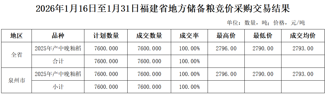- 2026年1月16日至1月31日福建省地方储备粮竞价采购交易结果 02-03