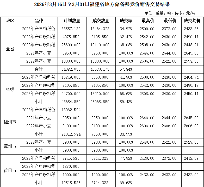 - 2026年3月16日至3月31日福建省地方储备粮竞价销售交易结果 04-03