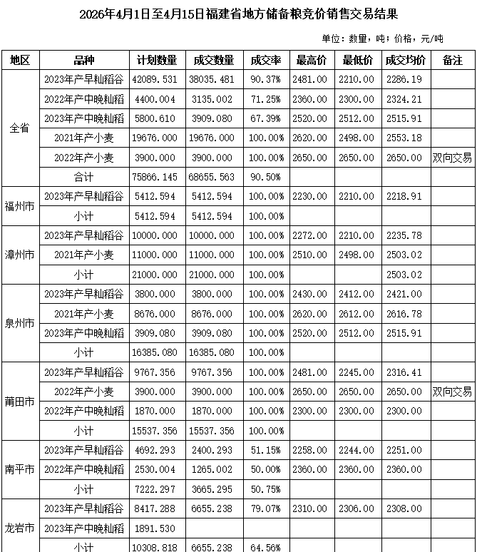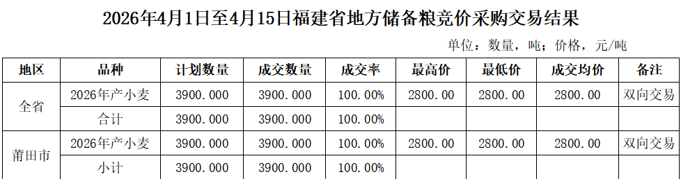 - 2026年4月1日至4月15日福建省地方储备粮竞价采购交易结果 04-17