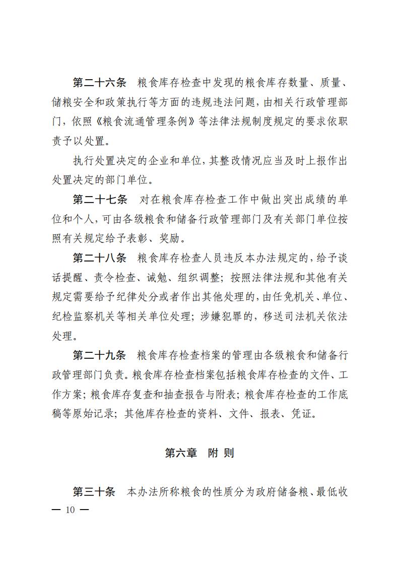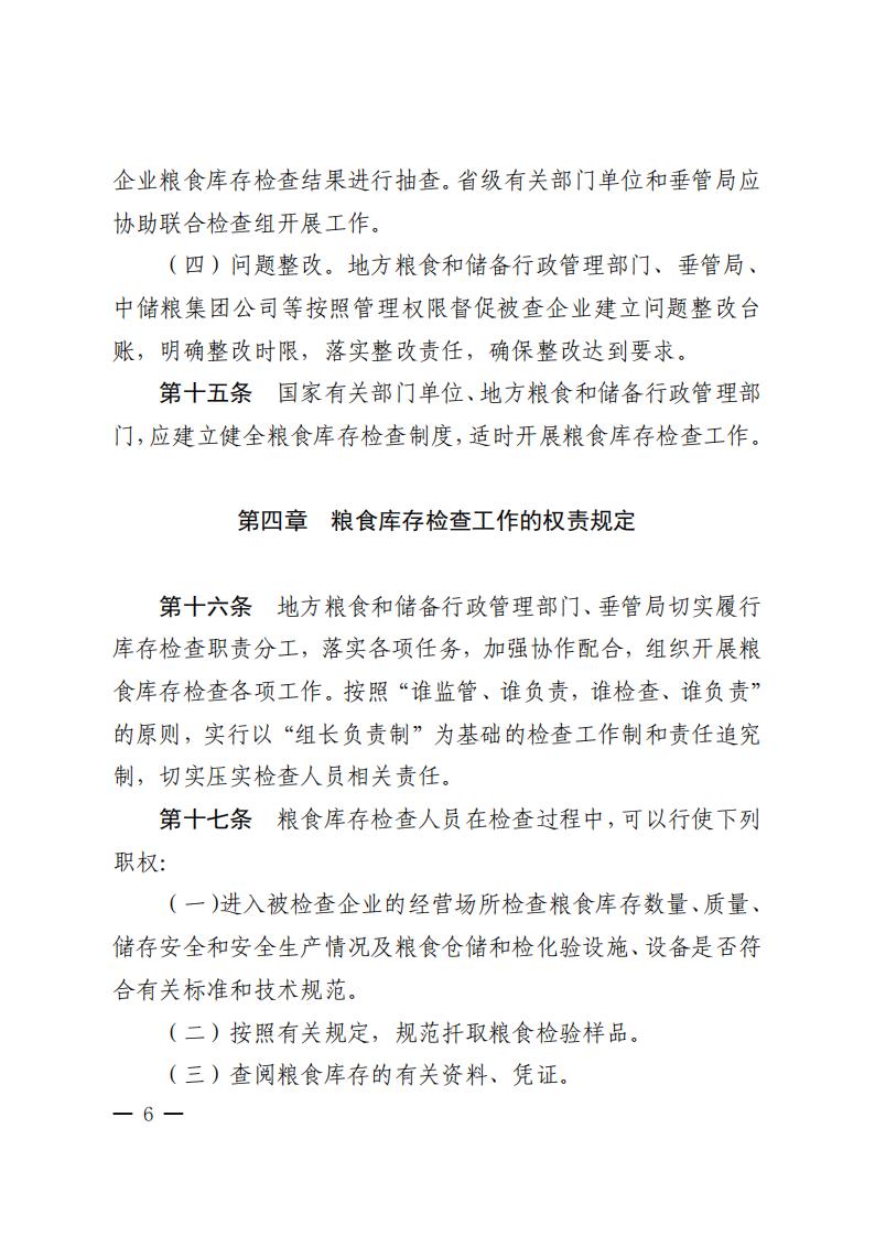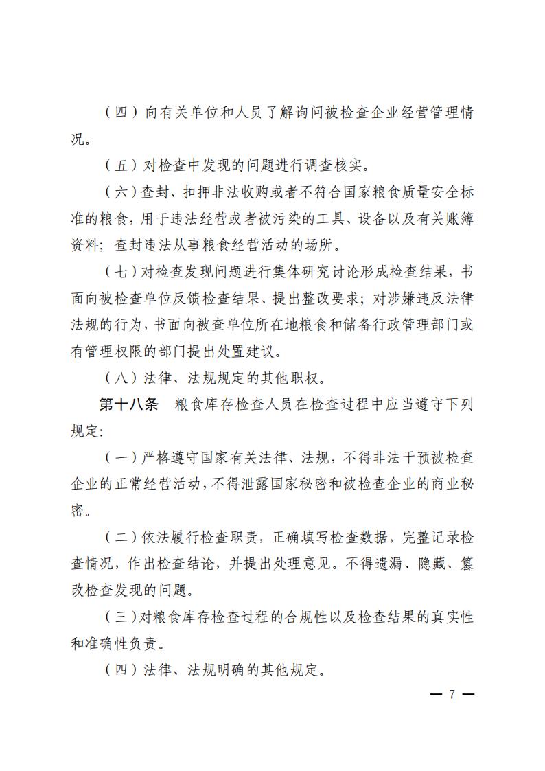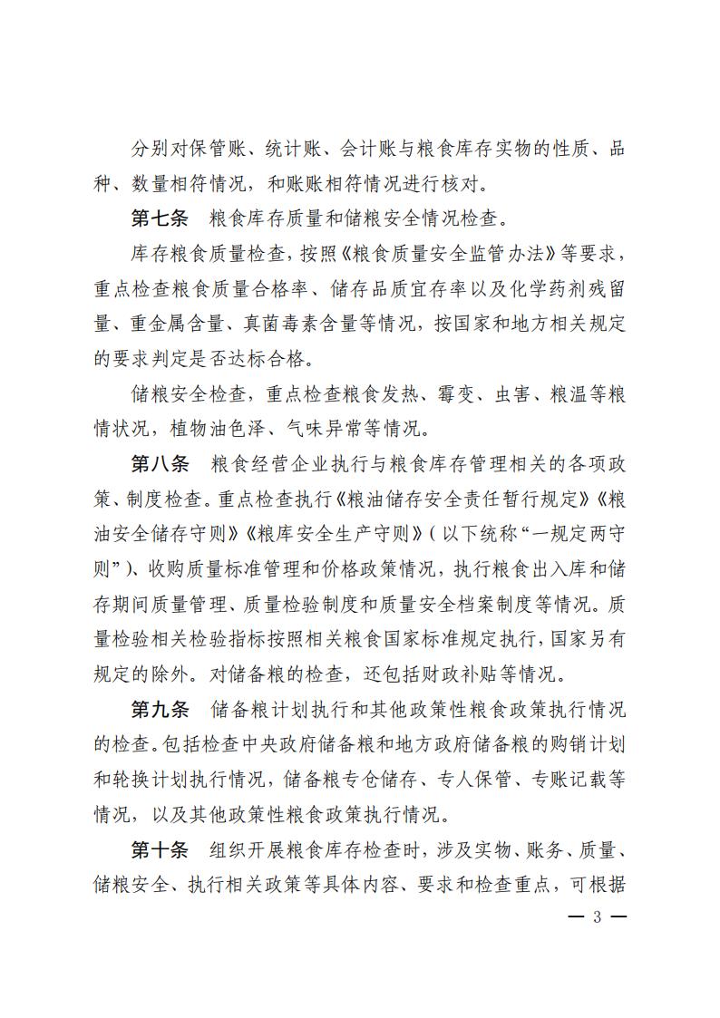 为贯彻落实《粮食流通管理条例》(国务院令第740号),规范对粮食经营企业的粮食库存检查工作,准确掌握粮食经营企业库存粮食的品种、数量、质量等情况,监督和指导粮食经营企业加强库存管理,及时发现问题、堵塞漏洞、消除风险隐患,国家粮食和物资储备局会同国家发展和改革委员会、财政部、中国农业发展银行制定了《粮食库存检查办法》,现印发给你们,请遵照执行。